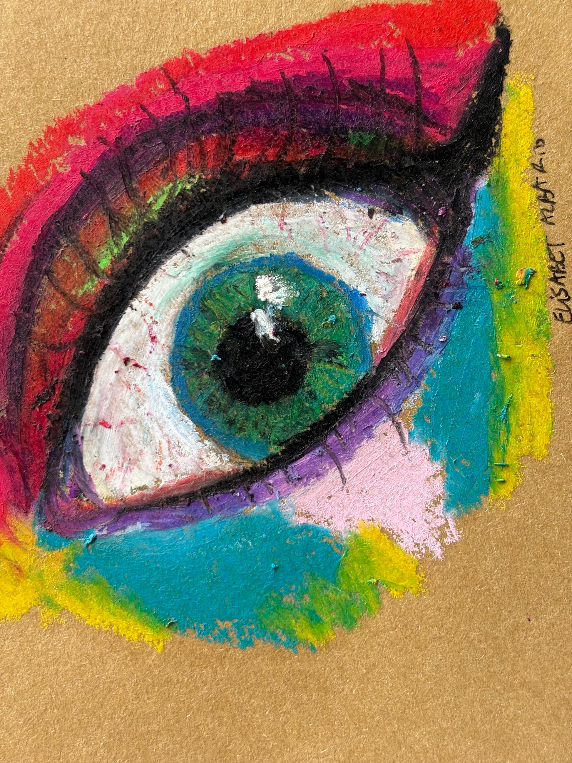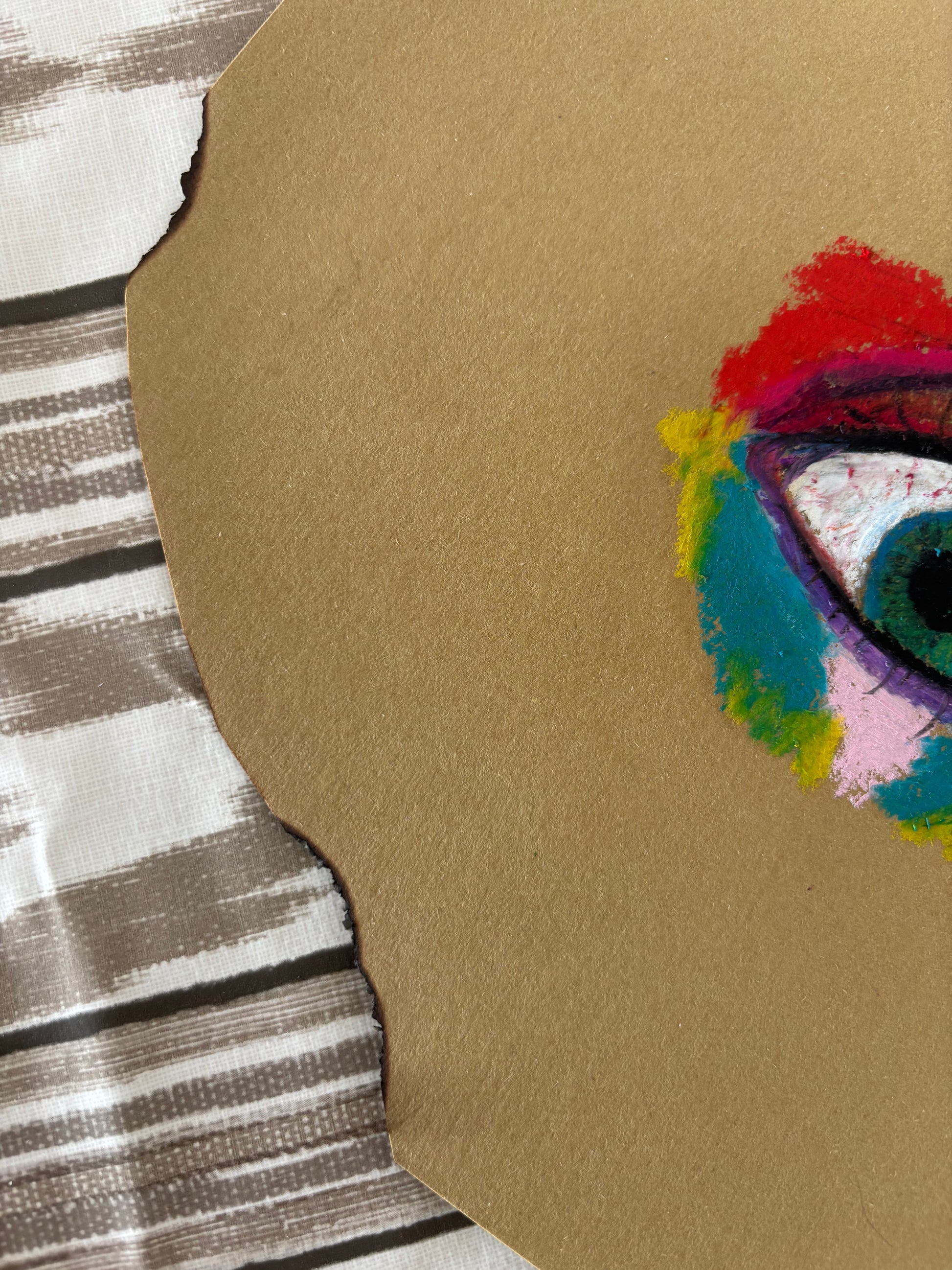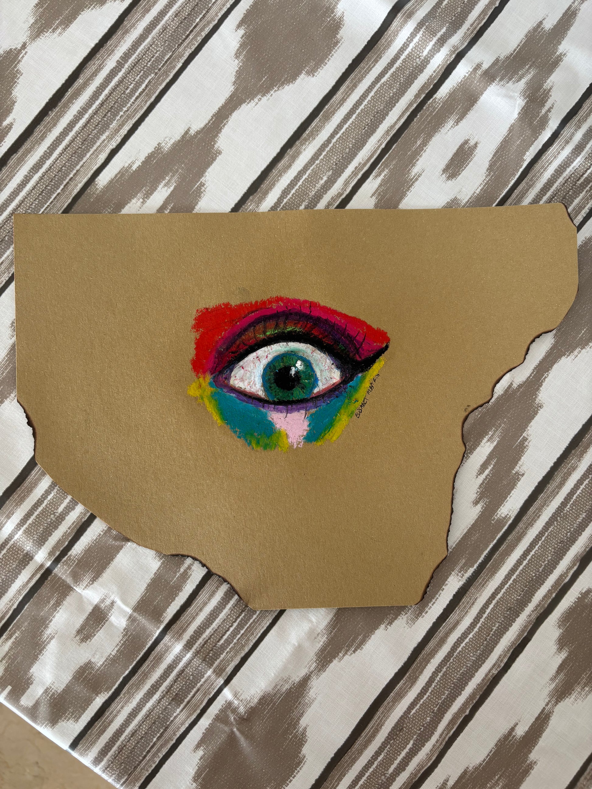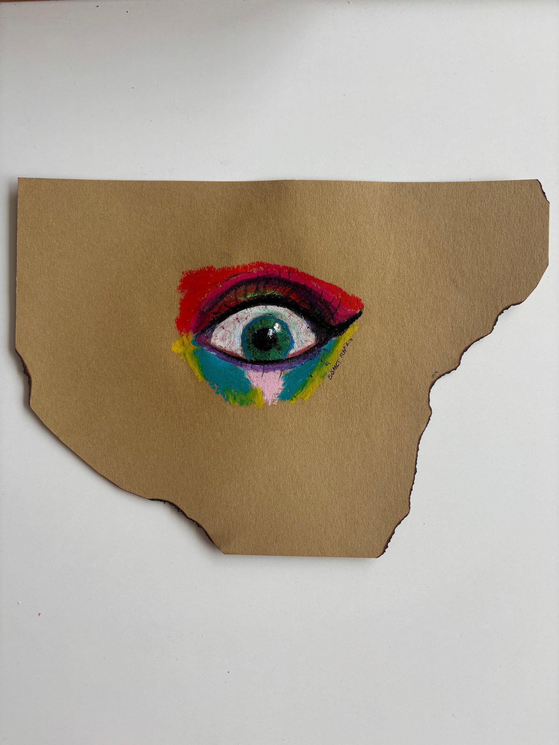 This striking artwork, created with oil pastels on paper, captures the haunting intensity of a single eye, surrounded by bold, vibrant colors. The piece evokes a powerful sense of fragility and missed responsibility, reflecting the unspoken weight of moments when help could have been offered but wasn’t. The burnt, irregular edges of the paper add an extra layer of mystery and timelessness, as if the image has survived fire and memory alike.